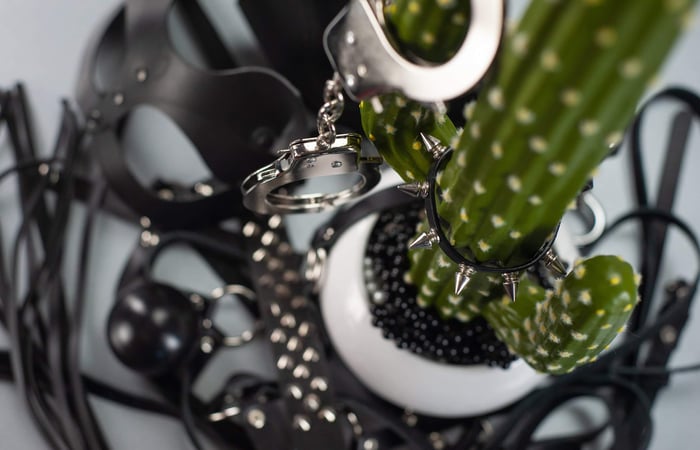 Small cactus with handcuffs and spiked ring around it. Various other kink implements surround the base of the cactus.
