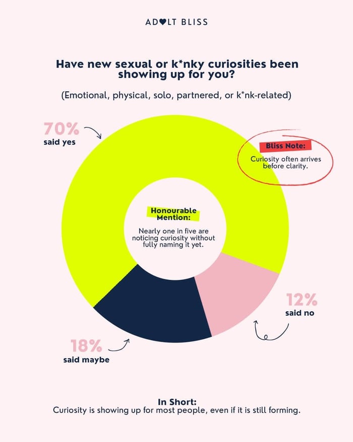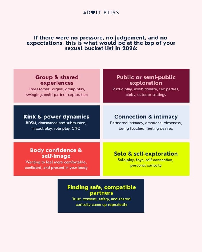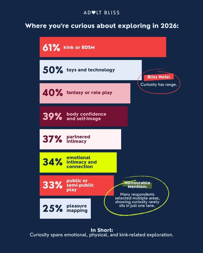 The survey showed that most people are curious to explore something new in 2026. Kink, toys and technology, group play, and deeper intimacy ranked highly, while time, energy, and confidence were the biggest barriers.