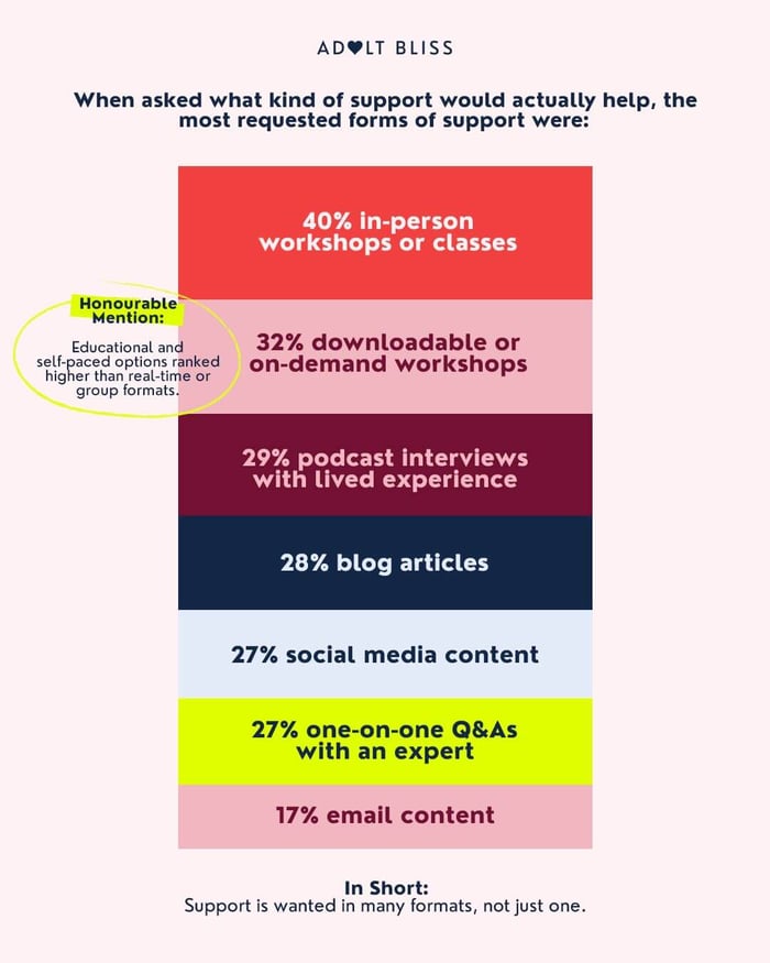 In-person workshops ranked highest, followed by downloadable or on-demand content, podcasts with lived experience, and educational blog articles. People want flexible, judgement-free learning options.